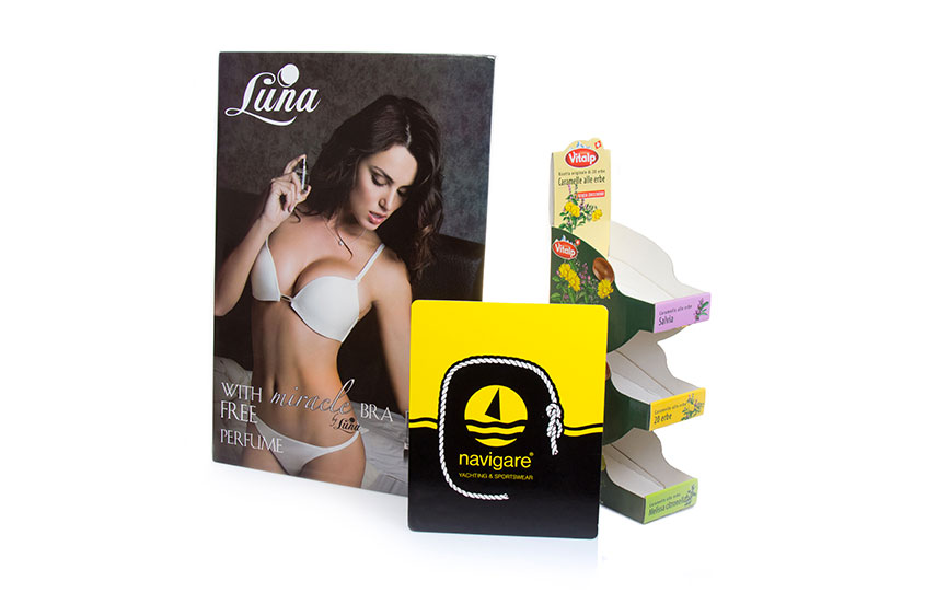 Produciamo espositori da banco/da terra, cartelli vetrina, dispenser.